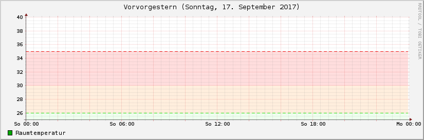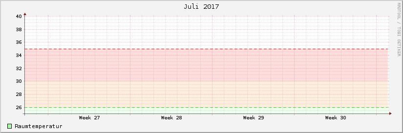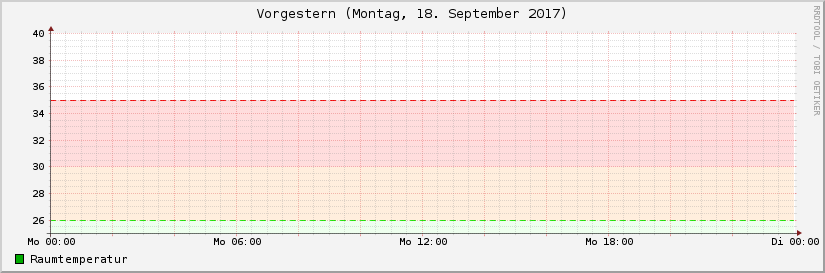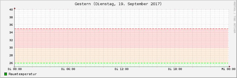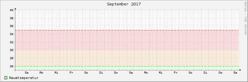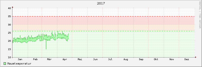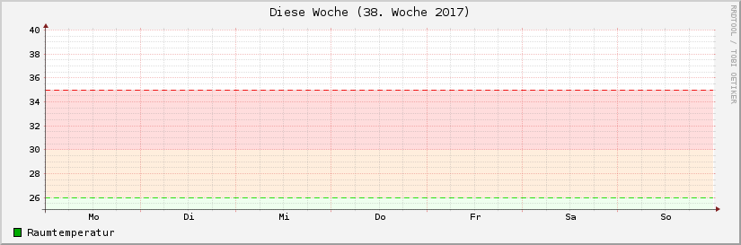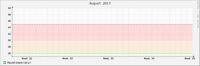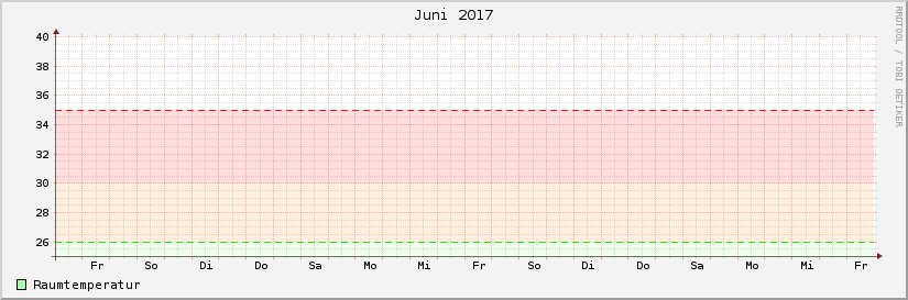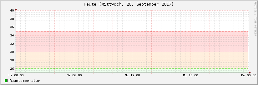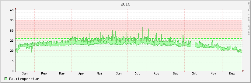 Raumtemperatur im ITZ 205/BV-LaborDie Raumtemperatur wird mittels eines DS18S20 und digitemp unter Linux gemessen und in eine rrd-Datenbank gespeichert.Der DS18S20 ist ein vollintegrierter, digitaler Temperatursensor von Dallas/Maxim mit 1-Wire-Bus, der eine Genauigkeit von ±0,5°C im Temperaturbereich von -10°C bis 85°C garantiert. Der Raum liegt an der Westseite des Gebäudes und verfügt nur über die im Gebäude übliche Belüftung. Obacht! Ab 3. 12. 2015 steht der Rechner nicht mehr im Raum ITZ 205! Die Technische Regeln für Arbeitsstätten, Raumtemperatur, ASR A3.5 sagt dazu: Die Lufttemperatur in Arbeitsräumen soll +26 °C nicht überschreiten. Beim Überschreiten einer Lufttemperatur im Raum von +26 °C sollen vom Arbeitgeber zusätzliche Maßnahmen ergriffen werden, z.B. Lüftung in den frühen Morgenstunden, Nutzung von Gleitzeitregelungen zur Arbeitszeitverlagerung, Lockerung der Bekleidungsregelungen und/oder Bereitstellung geeigneter Getränke (z. B. Trinkwasser). Bei Überschreitung der Lufttemperatur im Raum von +30 °C müssen wirksame Maßnahmen gemäß Gefährdungsbeurteilung ergriffen werden, welche die Beanspruchung der Beschäftigten reduzieren. Dabei gehen technische und organisatorische gegenüber personenbezogenen Maßnahmen vor. Wird die Lufttemperatur im Raum von +35 °C überschritten, so ist der Raum für die Zeit der Überschreitung ohne technische Maßnahmen (z. B. Luftduschen, Wasserschleier), organisatorische Maßnahmen (z. B. Entwärmungsphasen) oder persönliche Schutzausrüstungen (z. B. Hitzeschutzkleidung), wie bei Hitzearbeit, nicht als Arbeitsraum geeignet. Tagesgraphen![]()